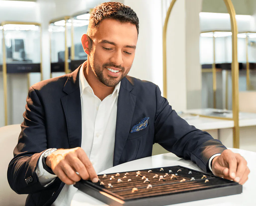 | What is the vision? | Tell us about her favourite jewellery pieces, the styles she wears, and what catches her eye. Share with us any reference designs (max 3) based on her taste. | Share with us your reference images (max 3) of a style you love and let us know your preferred metal colour, gemstones and ring profile. |