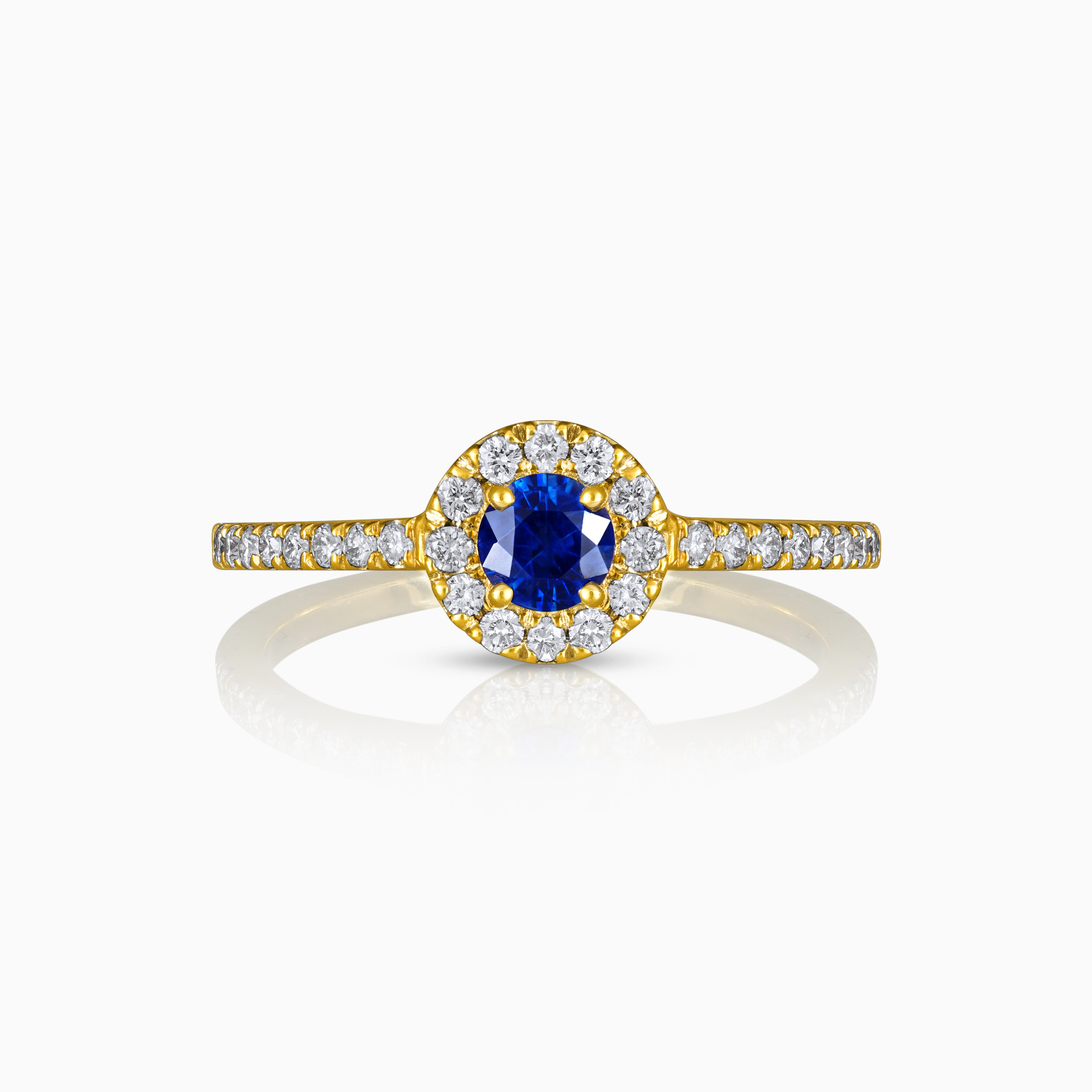 An enchanting ring with a sapphire heart and diamond constellations whispering love in each facet. Centred with a round cut velvety blue sapphire that is surrounded by a halo of round brilliant diamonds, the Abyssal ring is made ever more scintillating with a yellow gold band accented with half-shank diamonds.