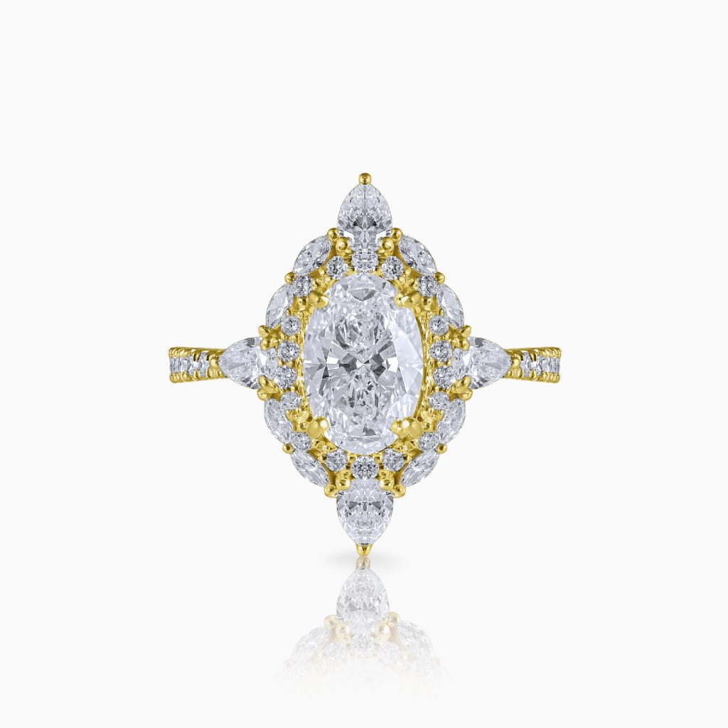 A constellation of brilliance worthy of an empress. In the Adela ring, at its heart lies an exquisite oval diamond encirled by a halo of round brilliant diamonds that amplify its celestial glow. Surrounding this luminous core, a circle of marquise diamonds are placed in perfect harmony with four pear diamonds poised at each corner to add an artistic symmetry to the ring top. The tapered yellow gold shank, adorned with half-shank round diamonds, elevates and completes the composition of this masterful design.