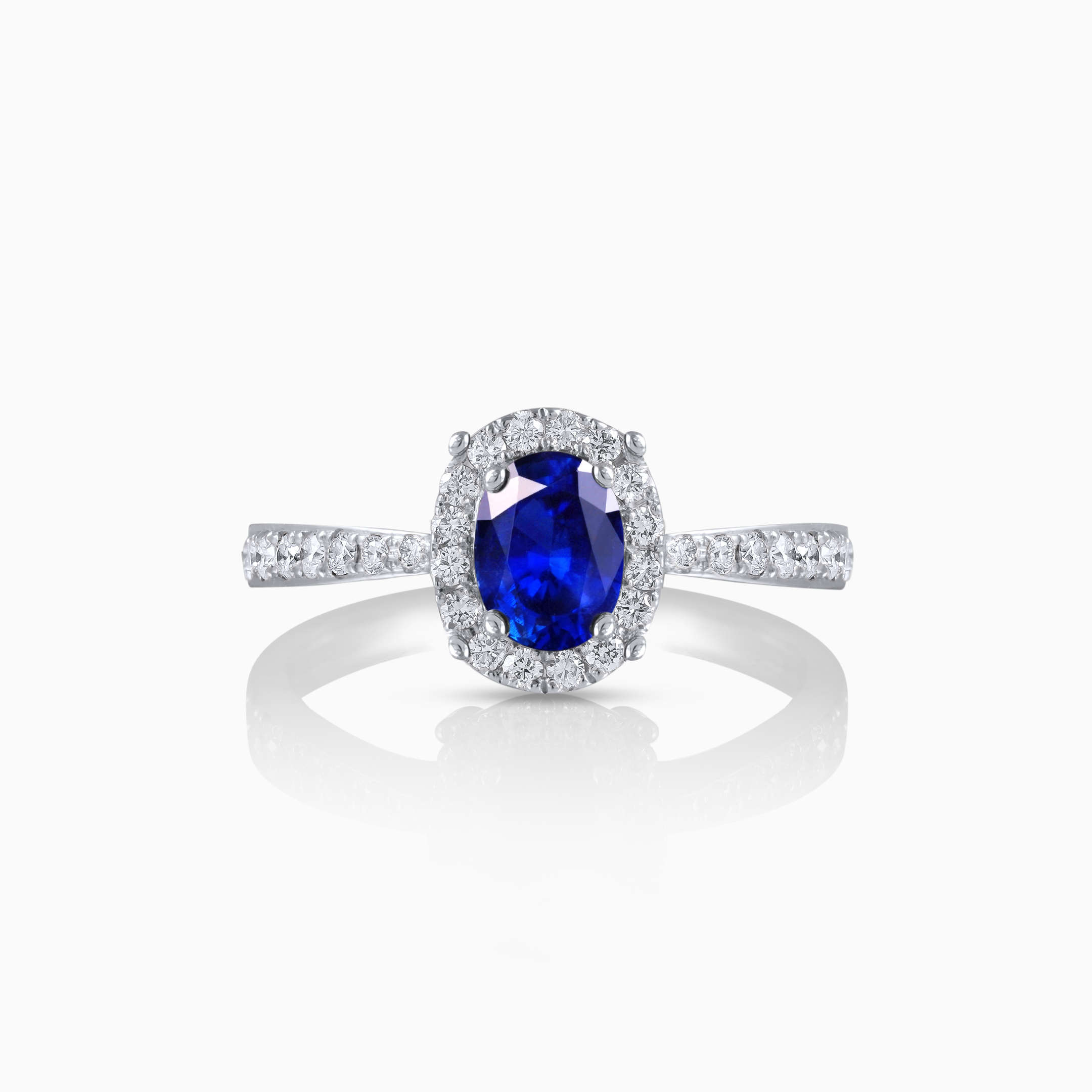A sapphire sky captured in metal and light, the Alice white gold ring features a mesmerising oval blue sapphire at its heart, encircled by a delicate halo of round brilliant diamonds that amplify its depth and glow. The tapered shank decorated with brilliant diamonds adds a refined touch, guiding the eye gracefully toward the centre stone, while the polished white gold setting lends a luminous backdrop.