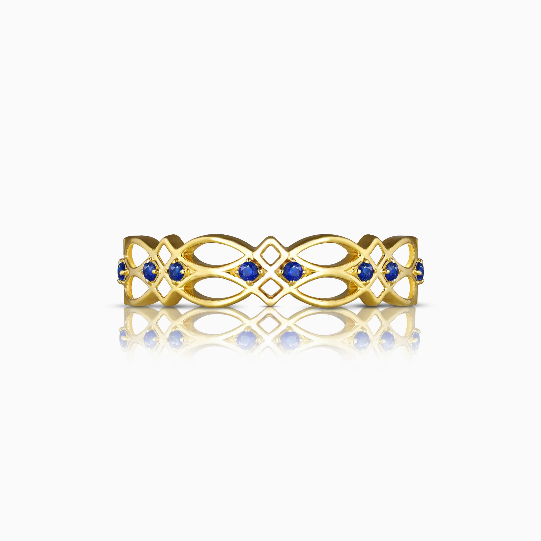 A symbol of love that flows without end, the Aveline wedding band is sculpted in graceful, intertwining curves of yellow gold, each line echoing the rhythm of two lives woven together. Set with round-cut blue sapphires nestled within its golden embrace, the band is a seamless composition of movement and brilliance,