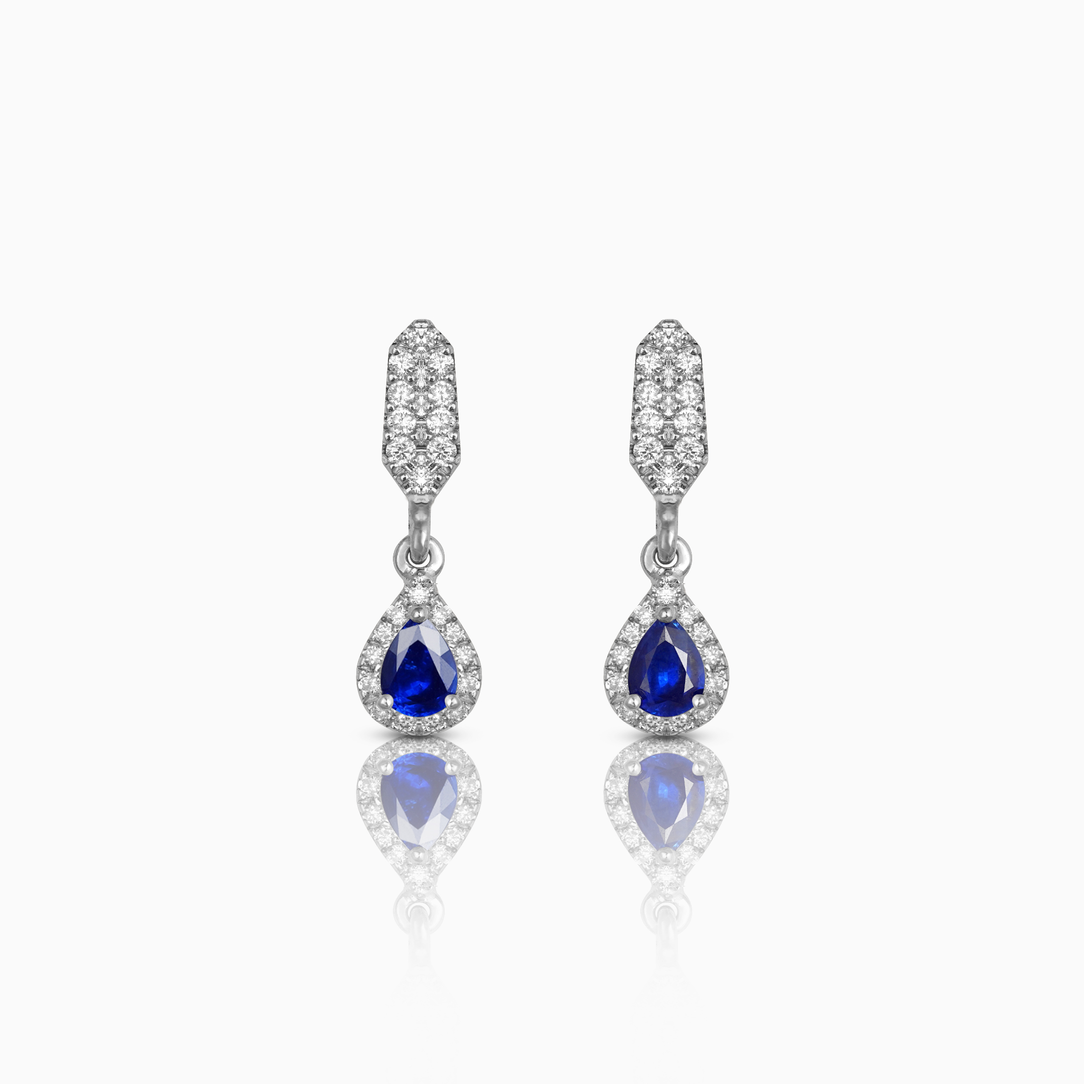Jewels that emanate courtly grace, the Bianca hanging earrings are crafted in luminous white gold, set with twin lines of scintillant lab-grown diamonds. Suspended at their ends are pear-shaped blue sapphires, each encircled by a line of lab-grown diamonds, evoking the splendour of courtly brilliance.