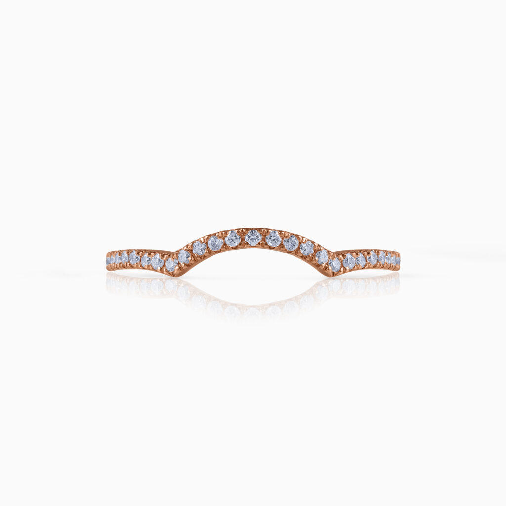 Mirroring the rhythm of two hearts intertwined, the Blair Ring is a breathtaking piece that speaks in curves, luminescence and timeless grace. The rose gold band’s elegant silhouette follows a gentle W-shape accented with round brilliant diamonds along the crest and is a perfect guard ring to be stacked with your engagement ring or worn as a standalone jewel.