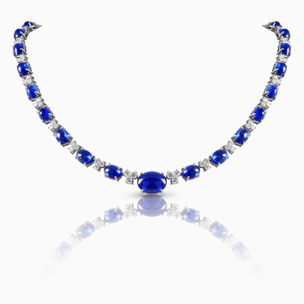 Inspired by the gemstone work that graced the Parisian ateliers during the art décor period, and the Agasti jewellery that adorned the noblewomen of Kandy, we present to you the Blue Empress Sapphires and Diamonds White Gold Necklace, crafted with oval shaped cabochon cut sapphires interspaced with round brilliant diamonds, featuring a melding of two civilisations in one masterpiece.
