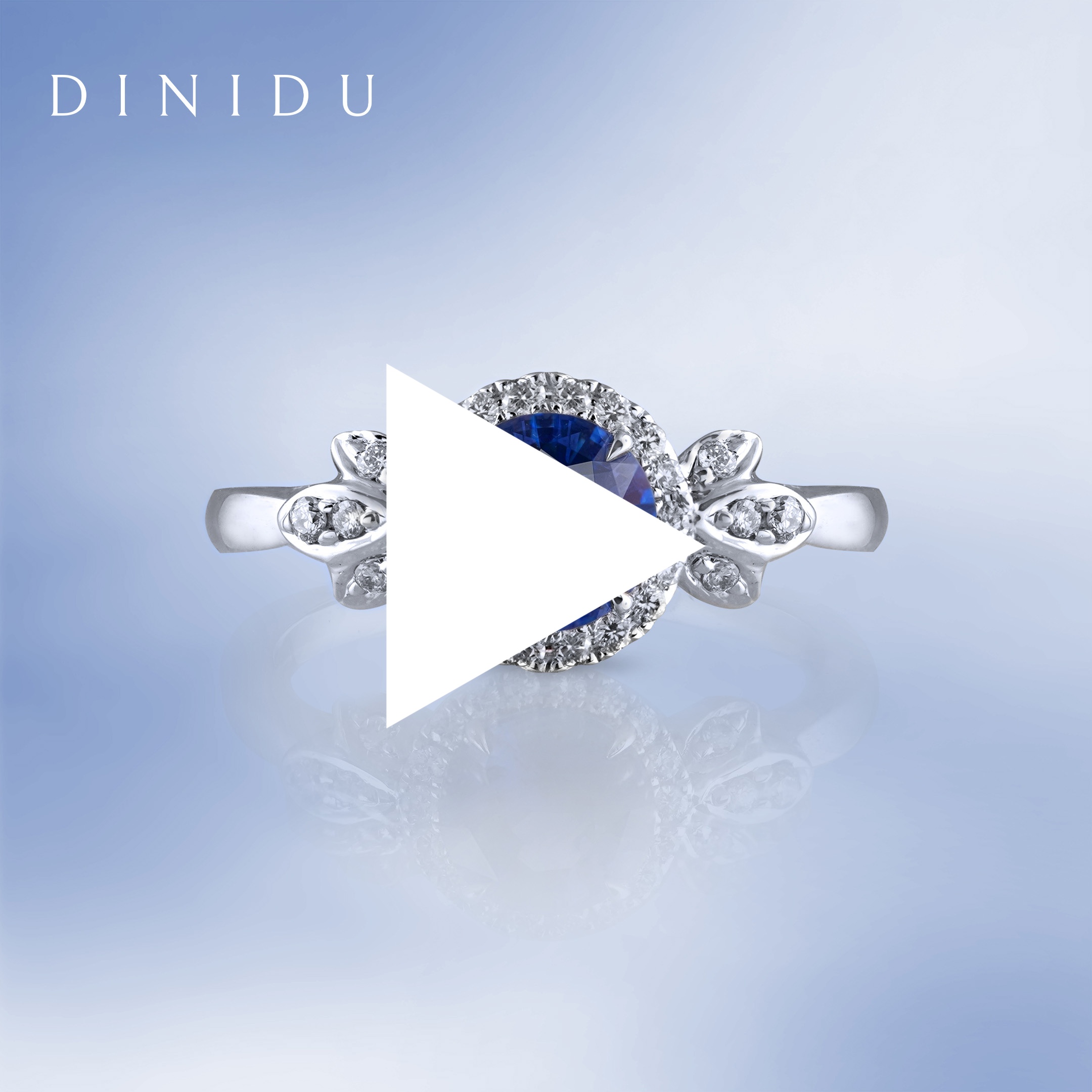 The blue sapphire and round brilliant diamonds white gold ring blooms eternally. Featuring a velvety sapphire surrounded by a halo of diamonds set on a white gold shank, it resembles a radiant flower with petals on either side.