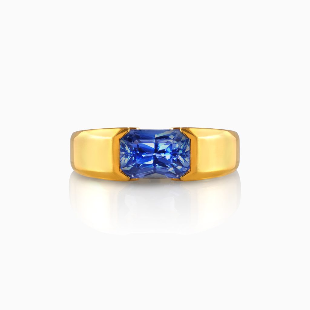 Embrace the beauty of contrast with a royal touch while wearing the blue sapphire and yellow gold ring. Centred with an emerald-cut blue sapphire, set into an effervescent yellow gold ring shank, it exudes unmatched elegance, nobleness, and power.