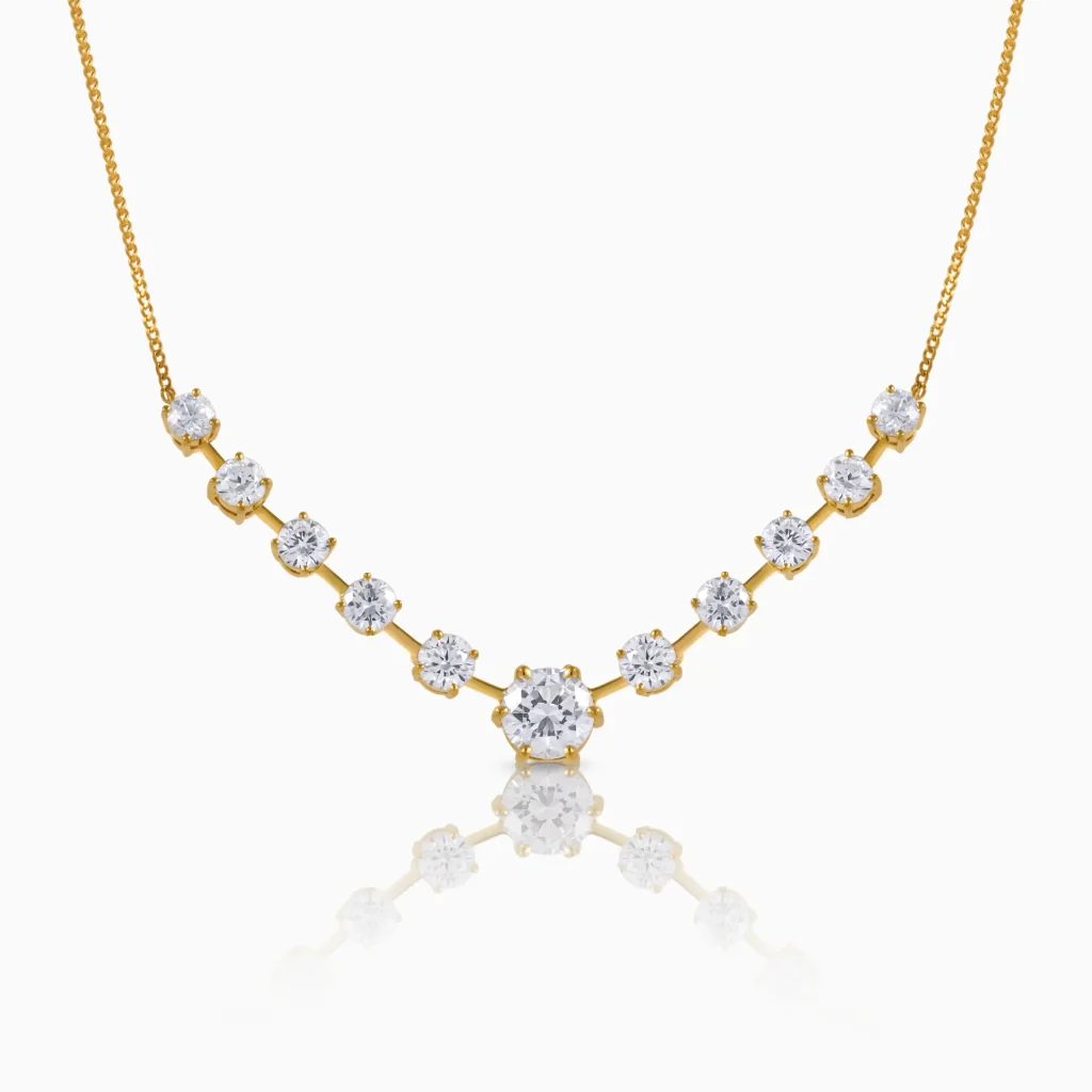 This Chrysella yellow gold necklace is a radiant celebration of light and grace. Its delicate yellow gold setting is connected with a finely crafted yellow gold chain that hugs the neckline with effortless sophistication. Featuring shimmering round cut cubic zirconia stones, this piece blends classic warmth with modern brilliance.