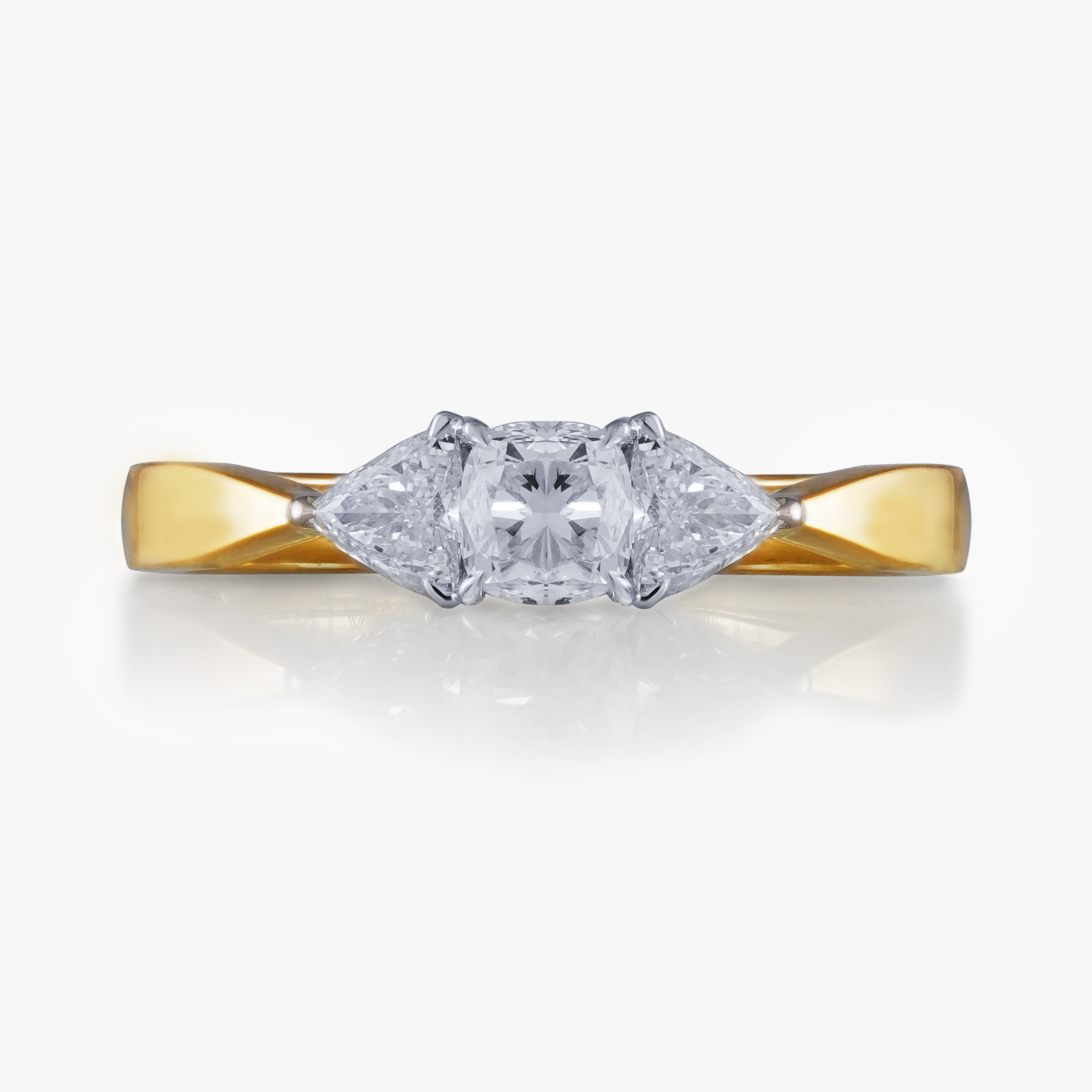 The cushion diamond and trillion diamonds yellow gold ring, akin to heavenly sunbeams, illuminates eternal love. With a cushion-cut diamond at the centre and trillion-cut diamonds on each side, it radiates divine brilliance on a shank of bright yellow gold.