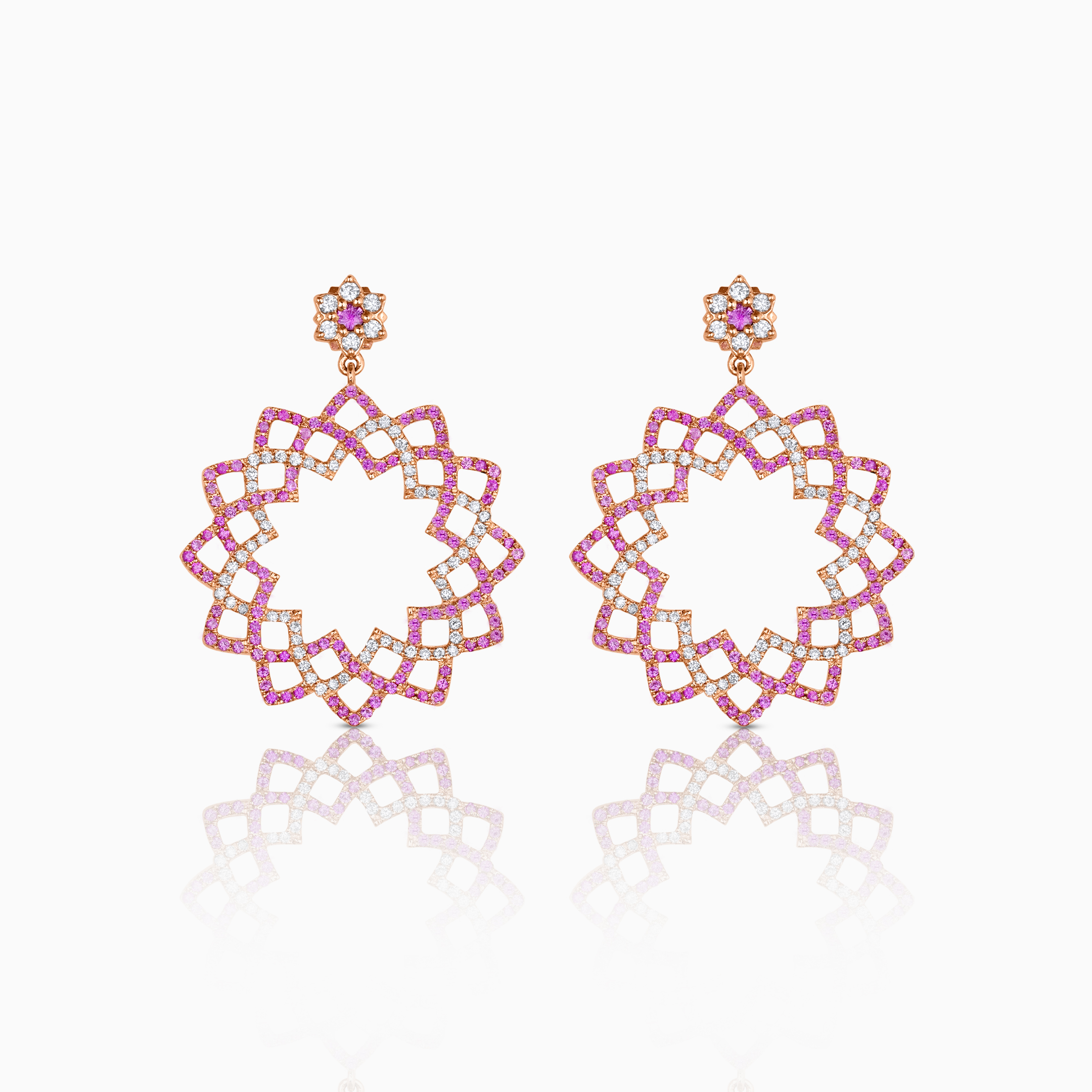 A timeless symbol of spiritual growth, rising from darkness to bloom in the light, this lotus-inspired rose gold earrings decorated with round brilliant diamonds and round cut pink sapphires are a stunning creation of tantric artistry brought to life.