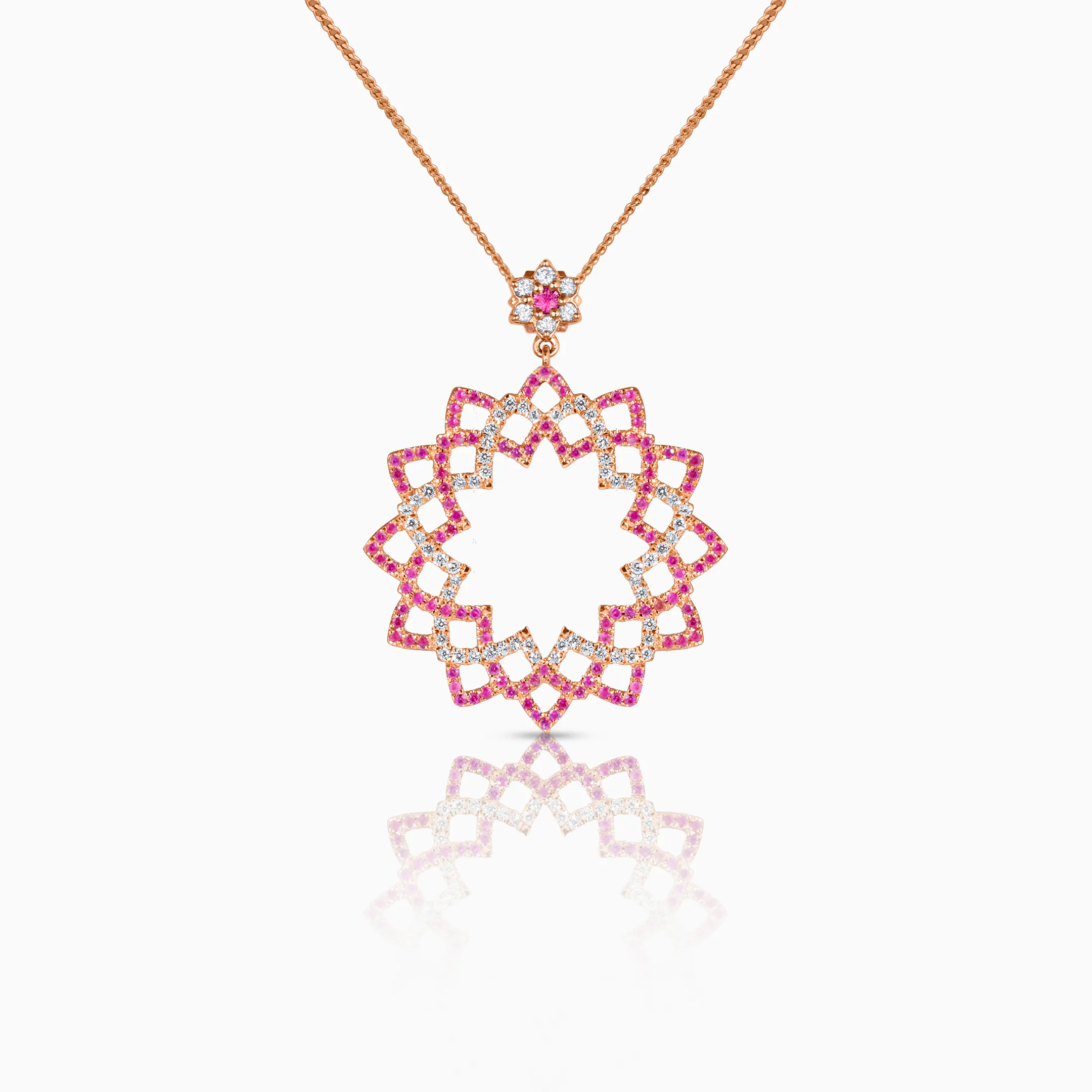 A timeless symbol of spiritual growth, rising from darkness to bloom in the light, this lotus-inspired rose gold pendant decorated with round brilliant diamonds and round cut pink sapphires are a stunning creation of tantric artistry brought to life.