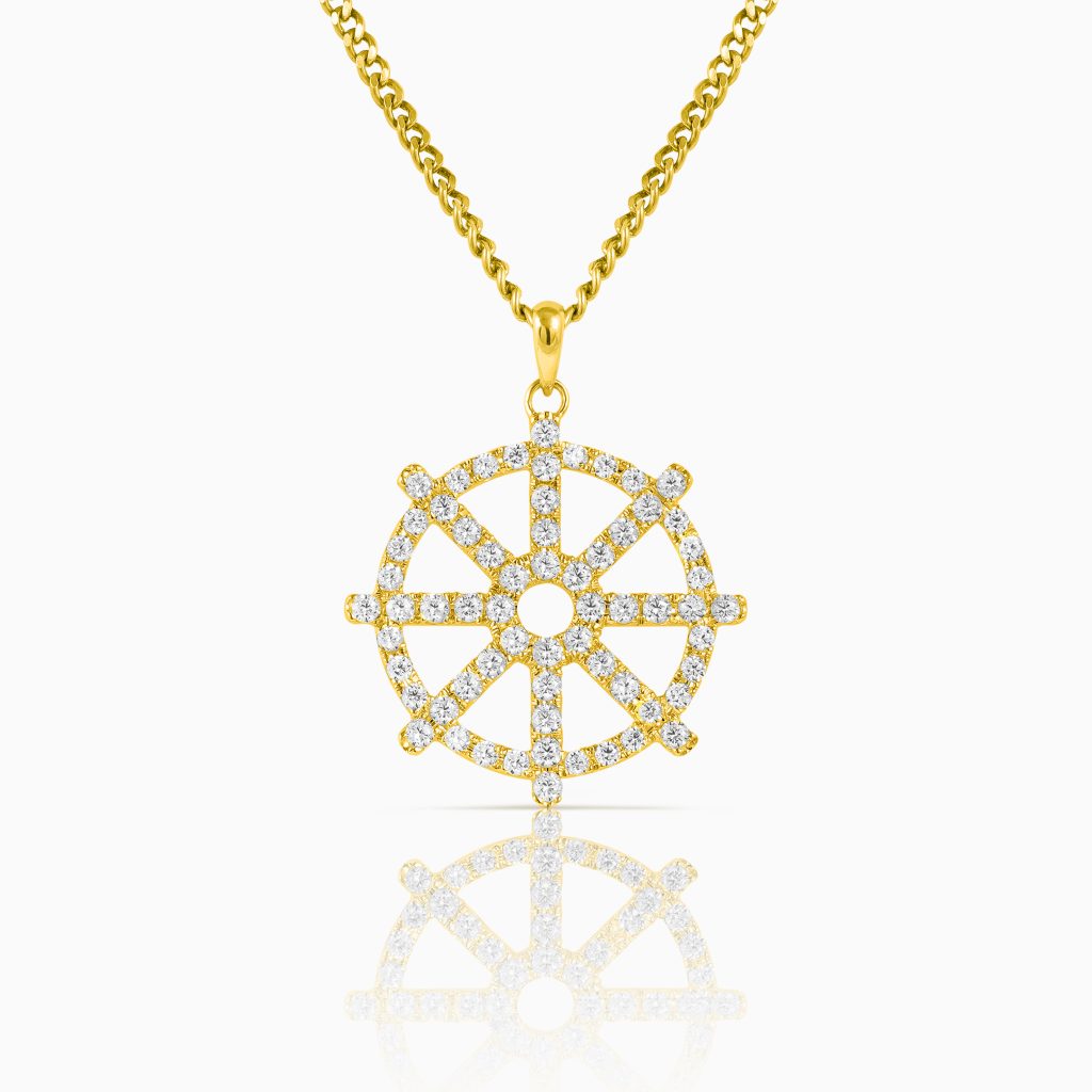 Experience divine elegance with the Dharmachakra pendant, symbolising Buddhist faith. Adorned with sparkling round brilliant diamonds set in yellow gold, the pendant embodies spiritual grace in exquisite craftsmanship