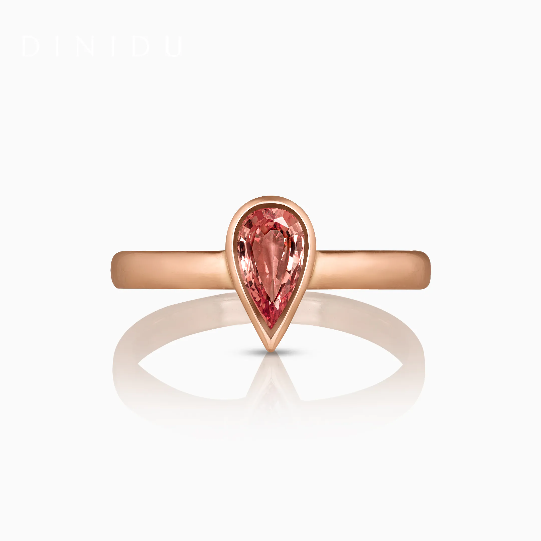 Pastels of sunset captured in a gemstone, the Dionne ring is set with a pear-shaped padparadscha that emanates a pinkish-orange glow, which sits on a lovely rose gold shank that beautifully compliments the wearer's skin.