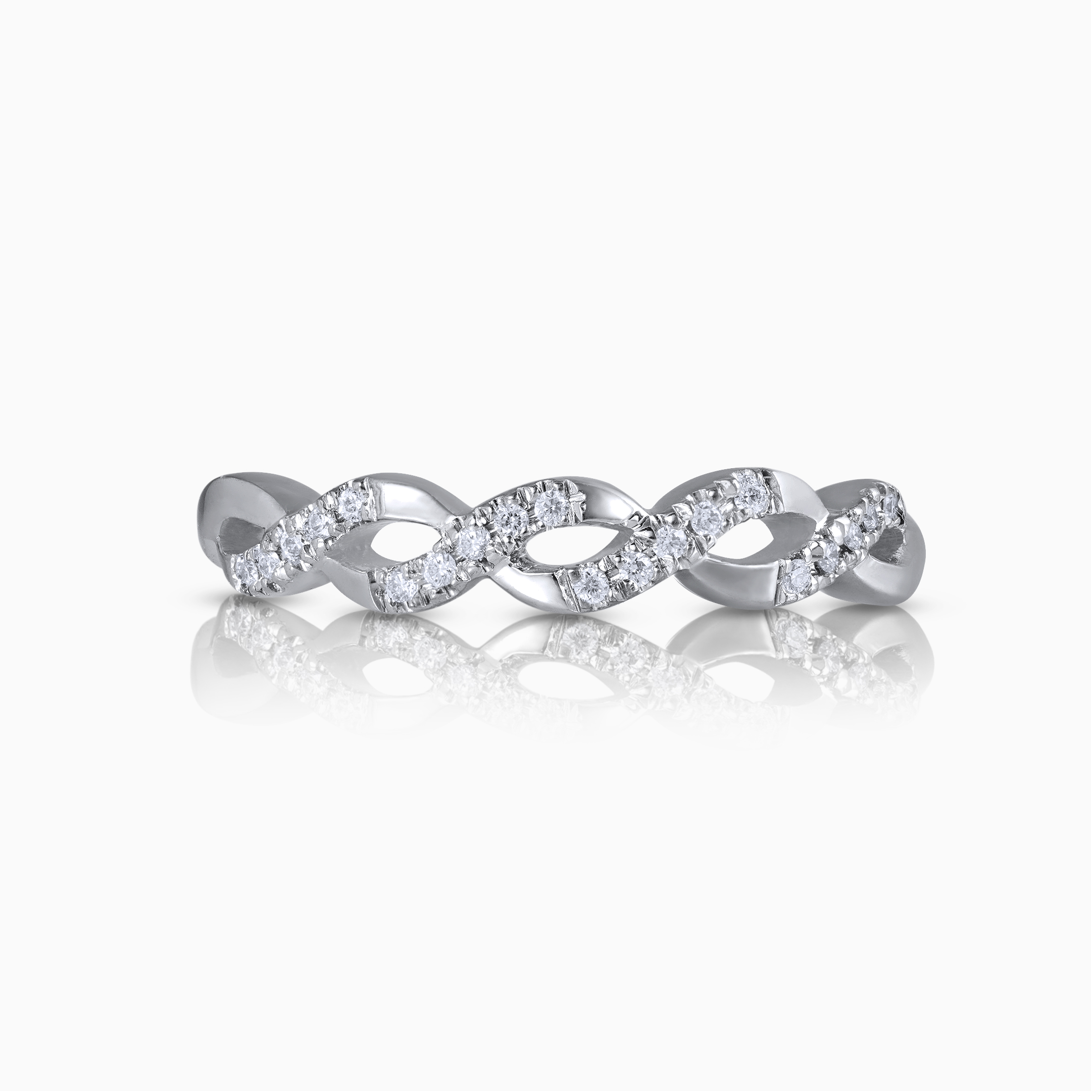 In an endless dance of light and form, the Donatella ring entwines twisting ribbons of white gold in graceful infinity curves in a half eternity setting. One thread shimmers with interspaced lines of round brilliant diamonds and the other of bright white gold catches the eye like starlight woven into silk.