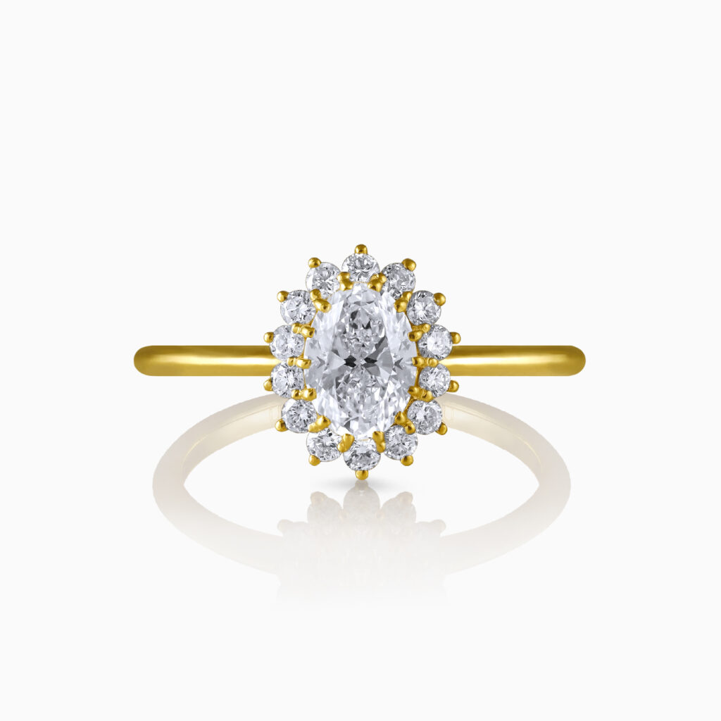 The exquisite Elise Ring is a celebration of brilliance, with a mesmerising oval cut brilliant diamond centre stone encircled by a delicate halo of smaller round brilliant diamonds, set on a polished shank of yellow gold.