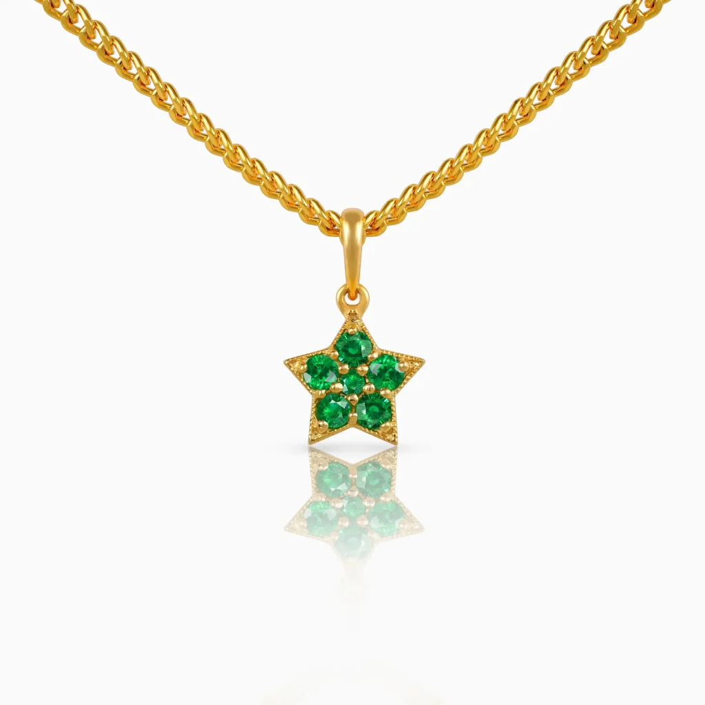 The Star Pendant is a charming jewellery craft to make any passerby gaze with starry-eyed wonder. This star shaped pendant feature verdant emeralds inlaid within a radiant yellow gold frame decorated with delicate carvings along the edge.