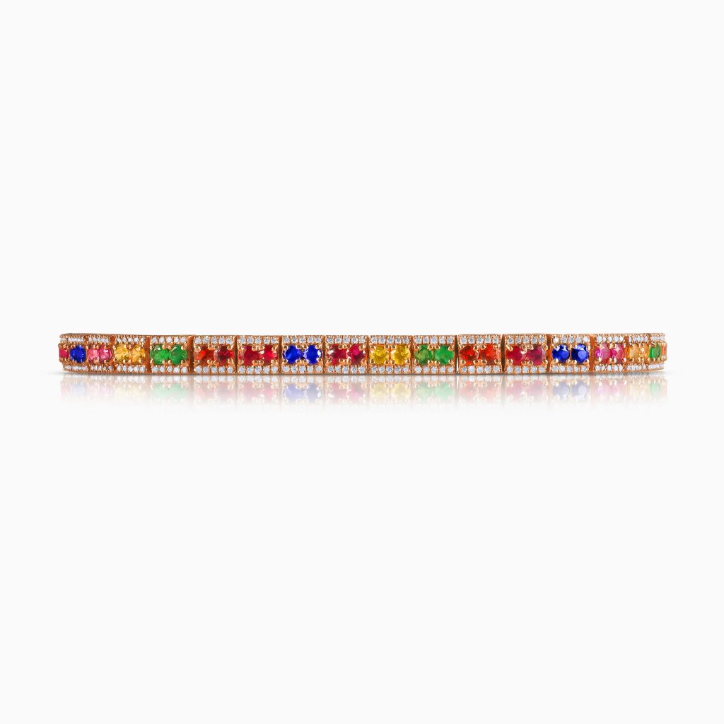 A symphony of colours to dance on your wrist, the Follia bracelet is where elegance meets vibrant artistry. Crafted in warm, glowing rose gold, it is adorned with a mesmerising array of round cut multicoloured sapphires and fiery rubies with round brilliant diamonds lining the edges.