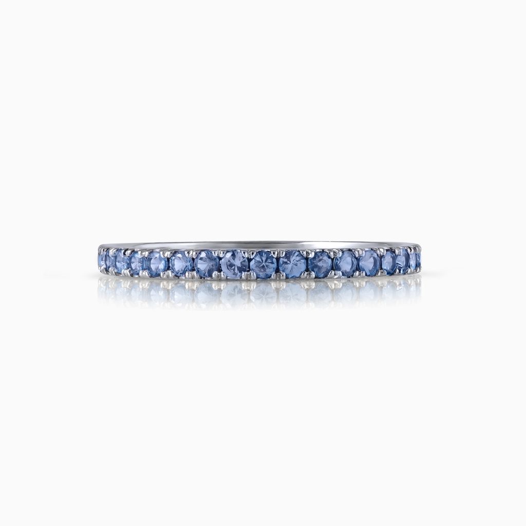 Set yourself apart from the rest with this favourite from our Forever Collection of stackable eternity bands. Featuring a white gold band studded with the wintry blue round cut blue sapphires in a half eternity setting, this band is a modern take on a classic style.