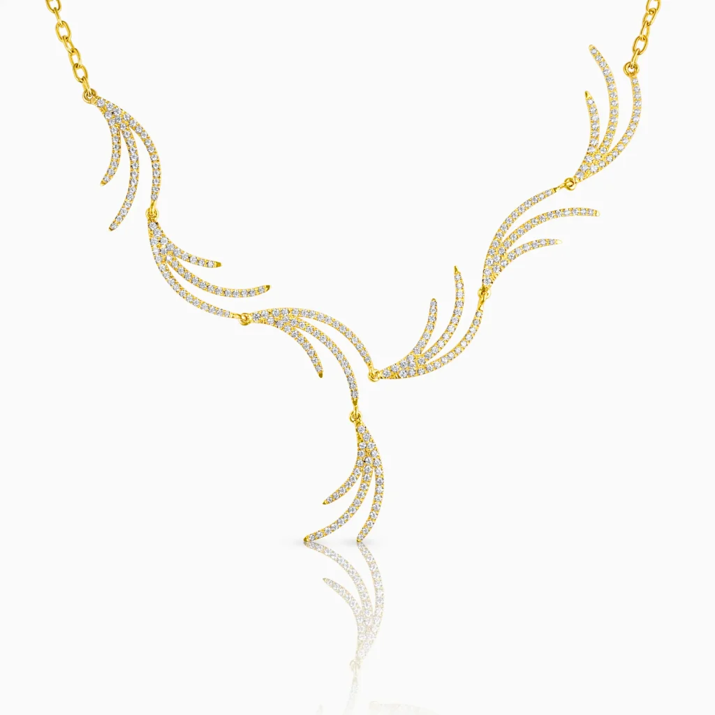 An ode to timelessness, the Frieda necklace is beautifully crafted in yellow gold and accompanied by a yellow gold chain with cubic zirconia stones decorating its geometric design.