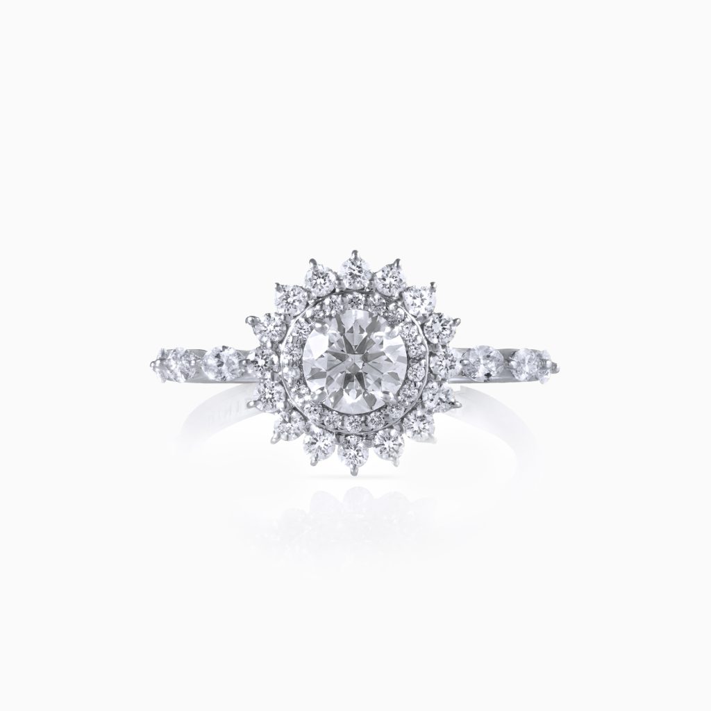 A burst of brilliance captured in a timeless design. The Helia Diamond Ring is centred with a majestic round brilliant diamond that is encircled by two concentric halos of differently sized diamonds, where the outer halo is placed with evenly spaced diamonds mimicking the rays of a midnight sun. The polished white gold shank is set with half shank marquise diamonds, extending an extraordinary brilliance across the every segment of the ring.