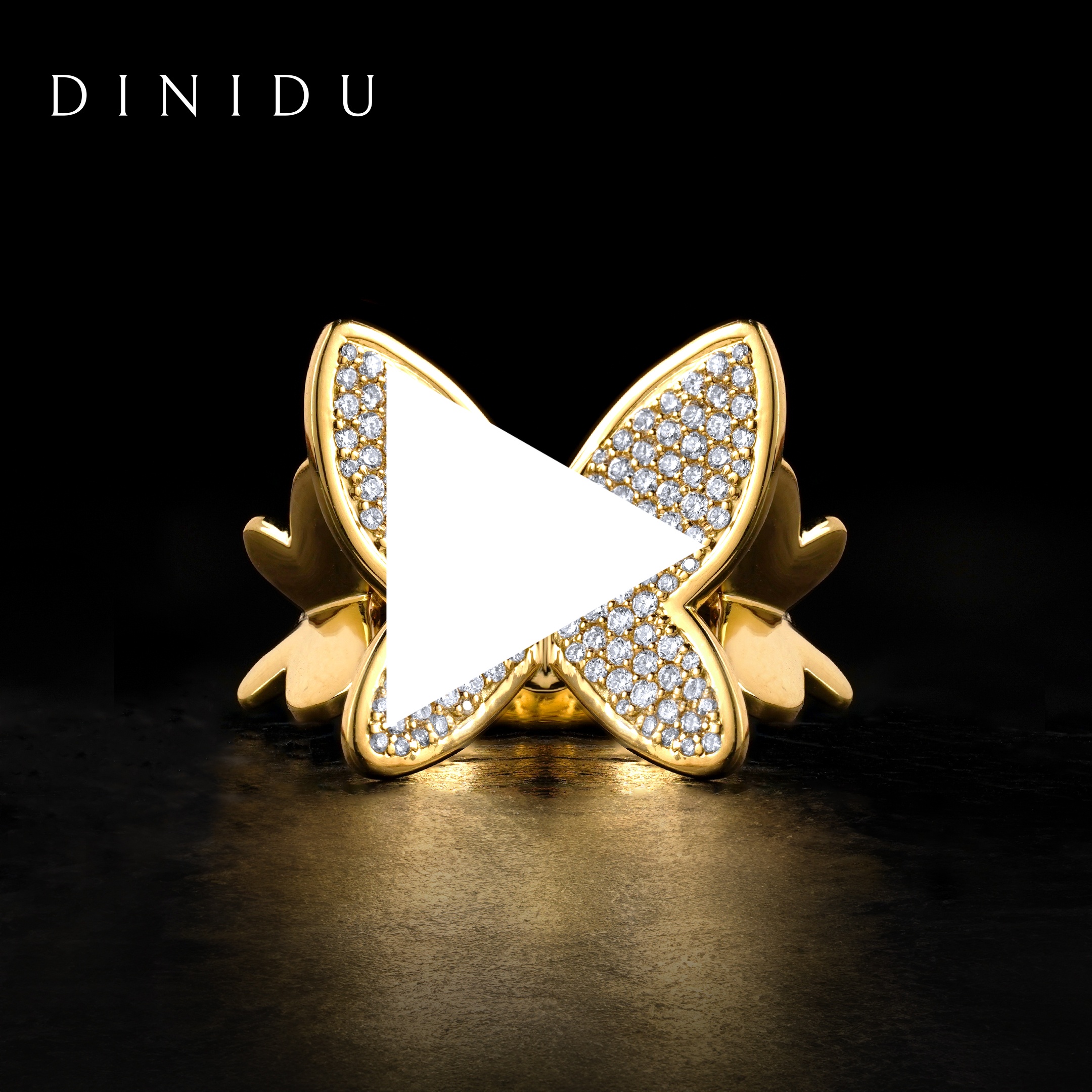 Embrace hope, love and new beginnings with the Lady Primavera Diamonds and Yellow Gold Butterfly Ring featuring a centre butterfly decorated with closely set round brilliant diamonds with side butterflies of yellow gold on a polished yellow gold shank.