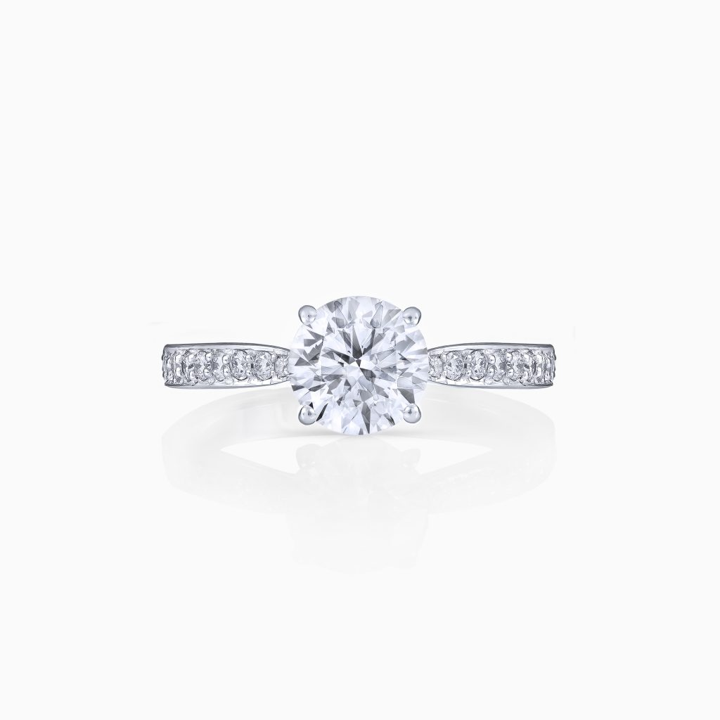 Crowned with a dazzling round brilliant diamond at its centre, the Leah ring is a testament to timeless beauty. The white gold shank adorned with smaller round diamonds, gently tapers into a pinched silhouette, creating a graceful and modern profile.