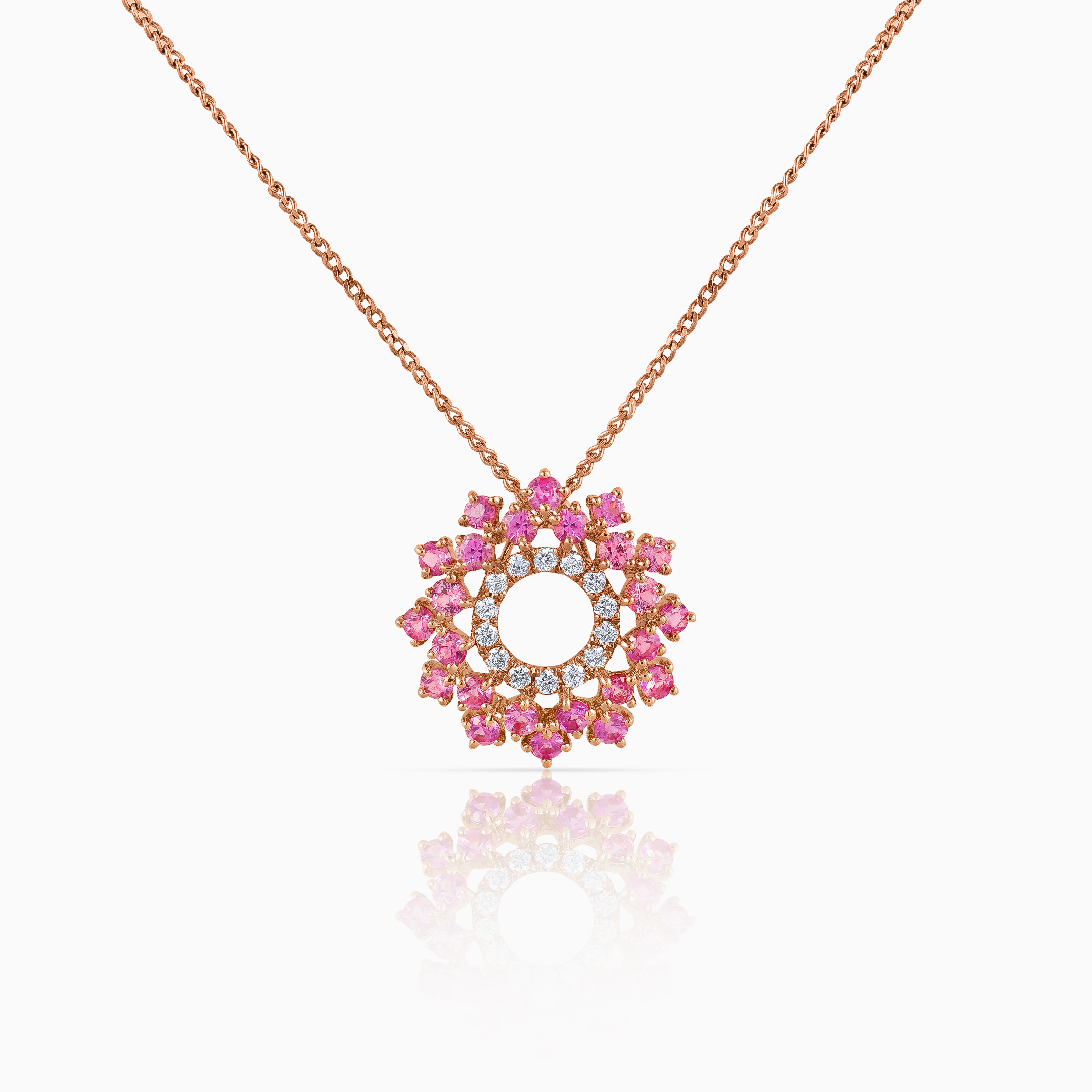The Milla Belle pendant embodies natural wonder painted in gemstones. Crafted with a central circle of round brilliant diamonds and concentric lines interspaced with round cut pink sapphires set in rose gold, this piece resembles a radiant pink blossom.