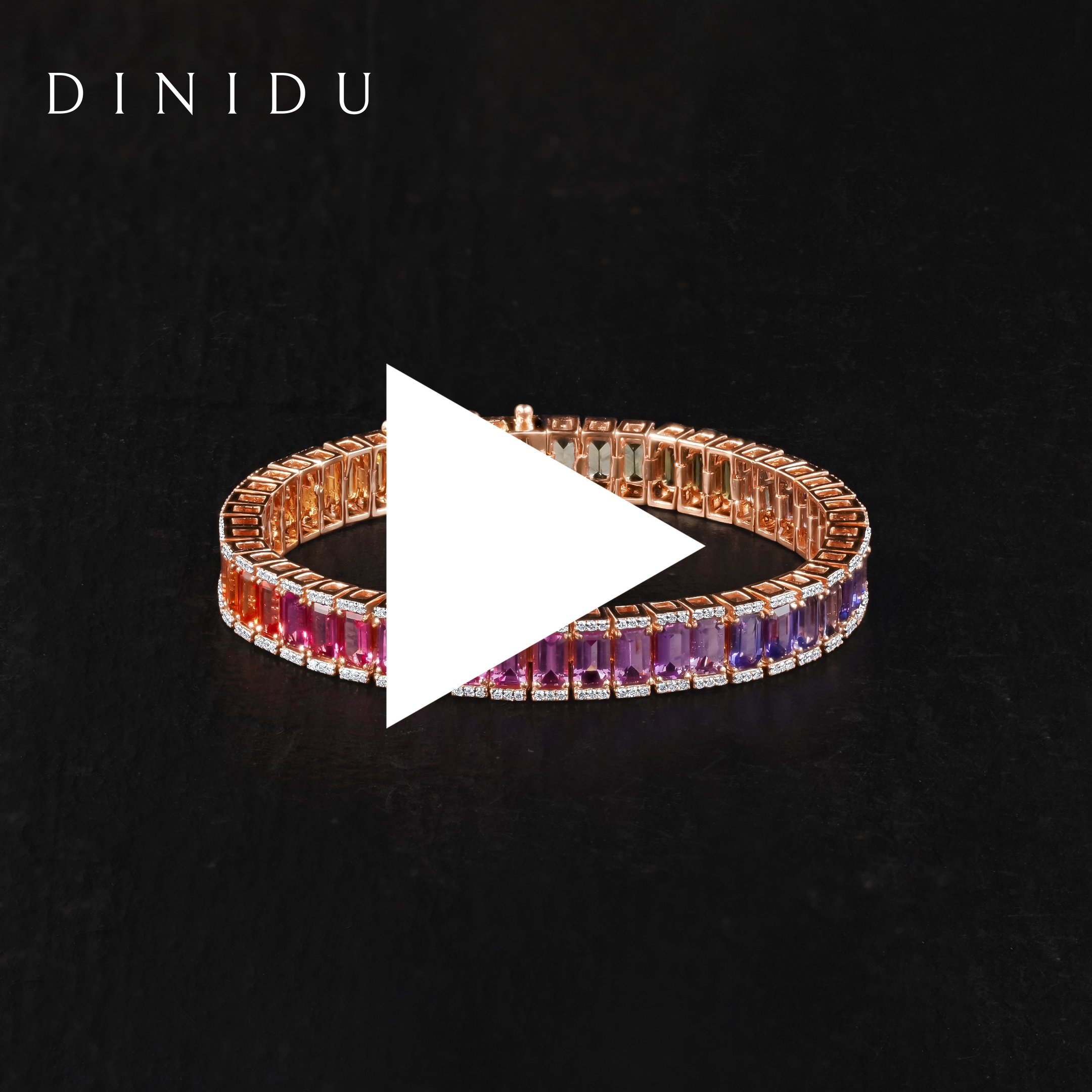 A mélange of colour and gemstones to adorn your wrist. This iconic rose gold bracelet is decorated with a centre line of closely set emerald cut multicolour sapphires with two round brilliant diamond borders completing this design with sparkle and symmetry.