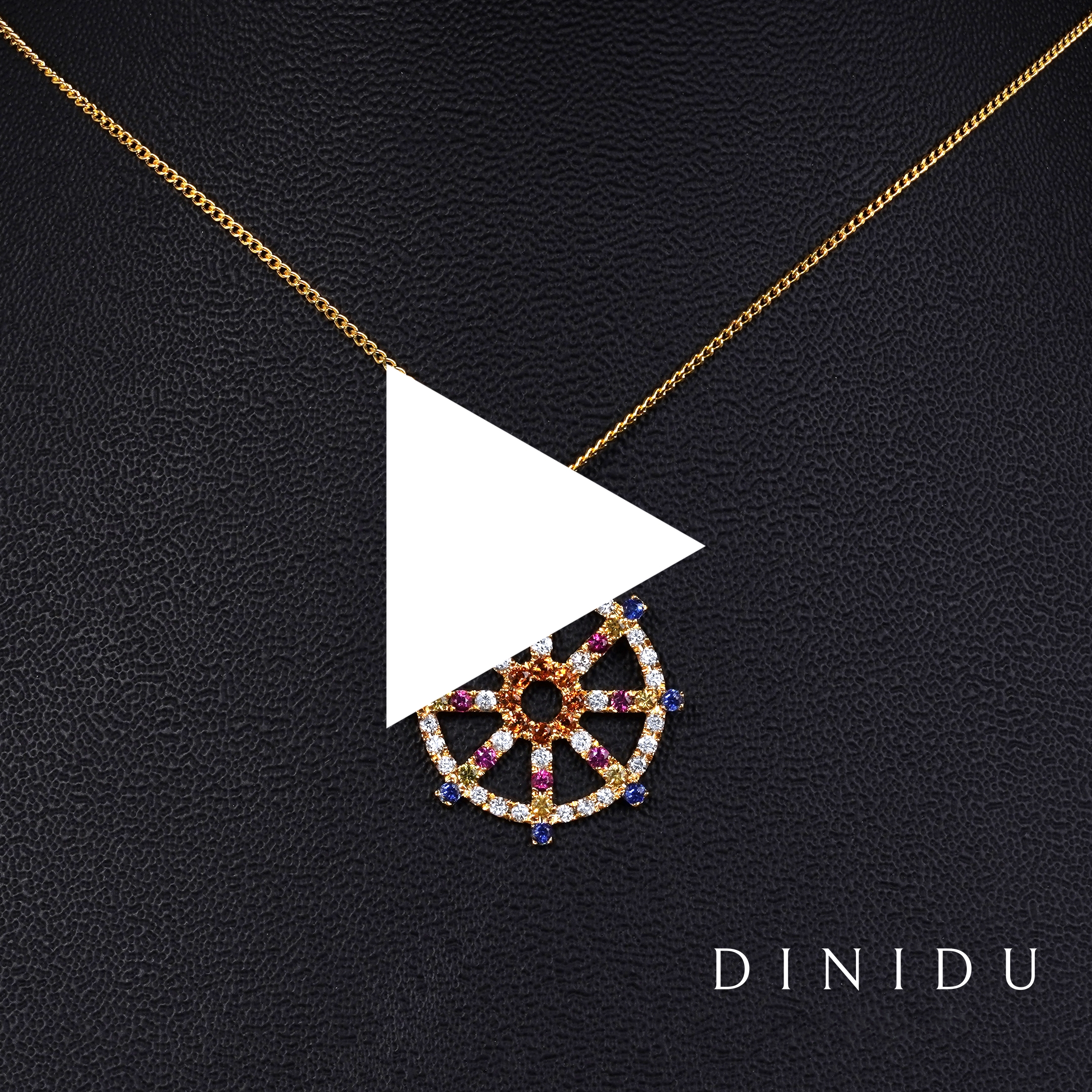 The multicoloured sapphires, hessonite garnets and round brilliant diamonds yellow gold dharmachakra pendant embodies faith and piety. Its intricate design features hessonite garnets at the centre, diamonds on the outer ring, and multicoloured sapphires on the spokes, symbolising the wheel of dharma.