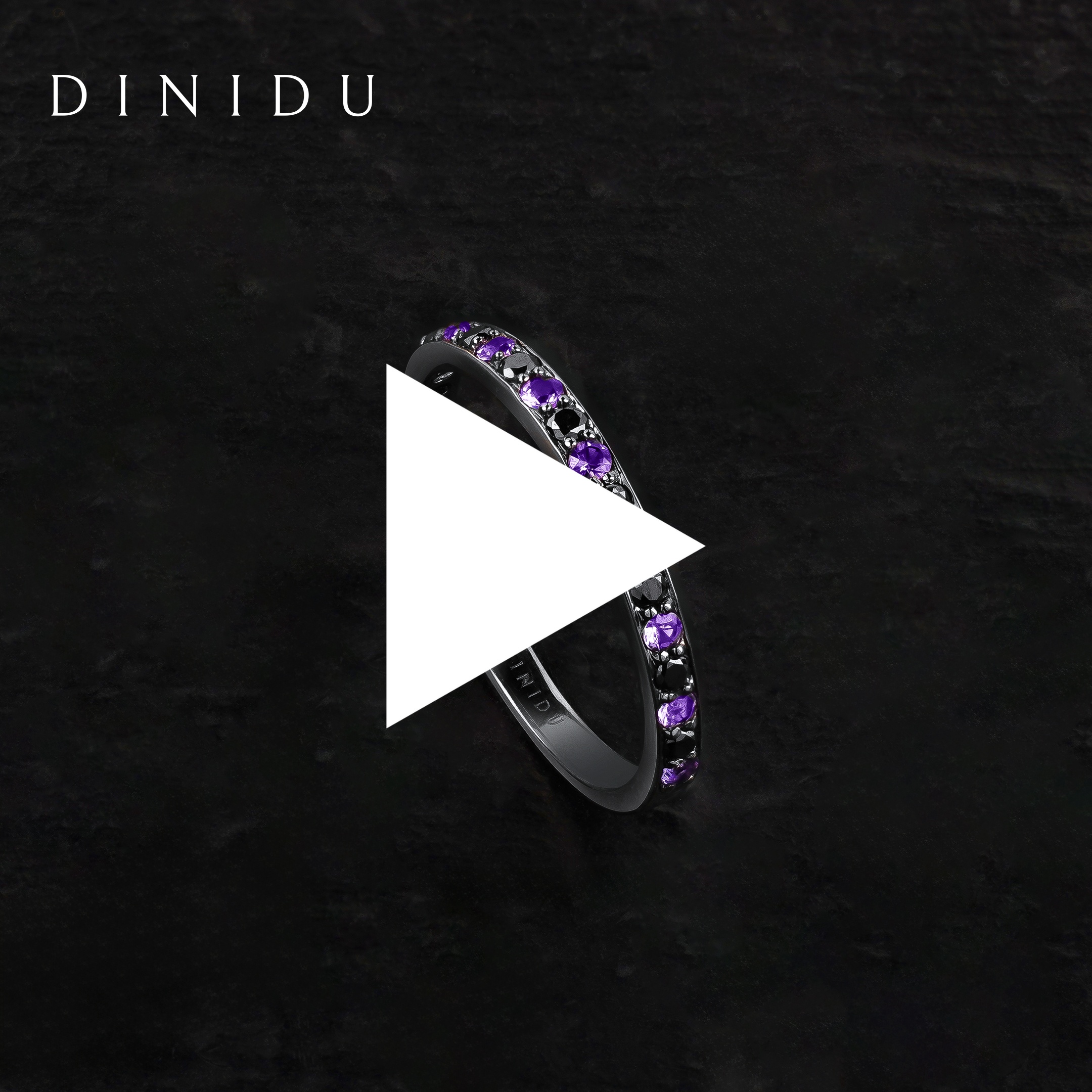 Presenting a striking fusion of colour and brilliance, the Nightfall Amethysts and Black Diamonds Band is an outstanding addition to our collection of half eternity stackable rings. Crafted with a unique black-plated white gold band, this ring beautifully contrasts the elegance of velvety round cut amethyst stones against the extraordinary lustre of round cut and treated black diamonds.