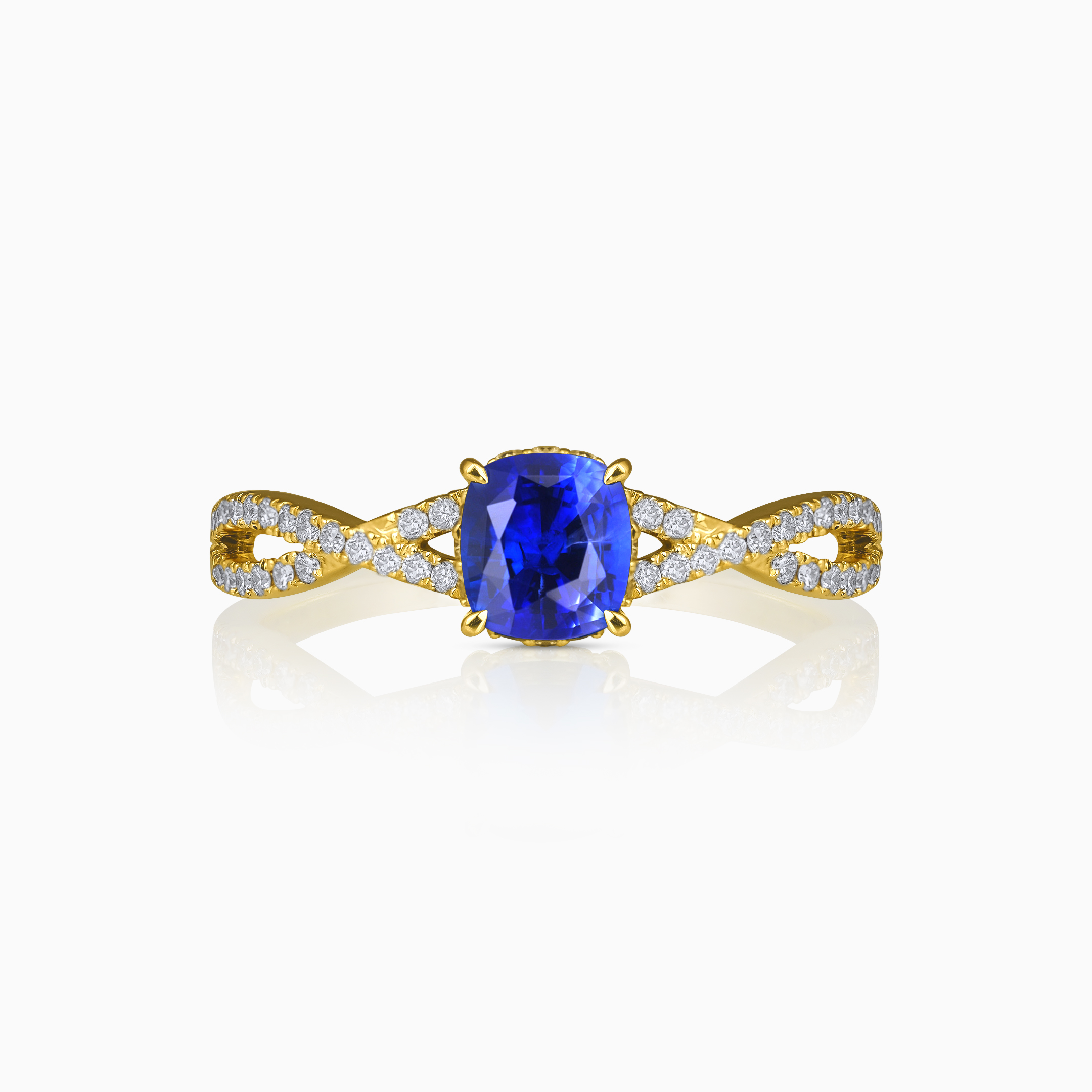 A statement of regal elegance, the Novelle ring is centred around a captivating cushion-cut royal blue sapphire, its deep, velvety hue evoking timeless sophistication. Framed by a delicate arrangement of round lab-grown diamonds, the design flows seamlessly into a half-infinity yellow gold shank.
