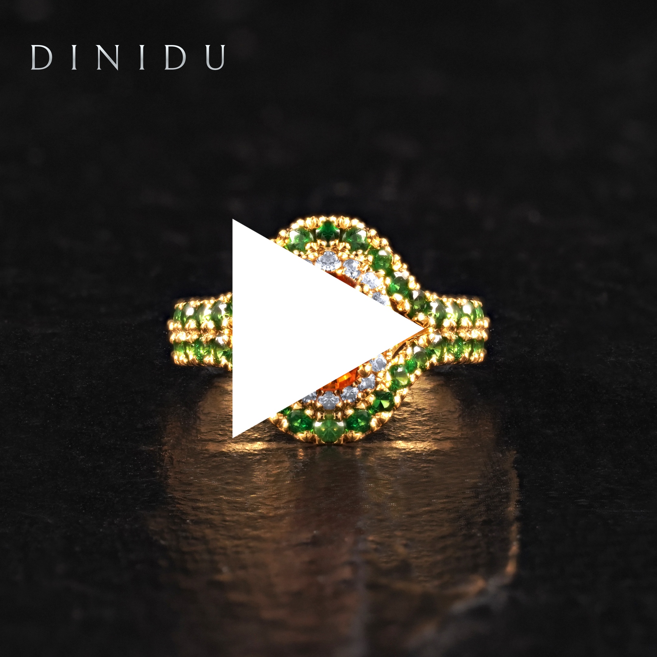 The Eye of the Dragon-inspired orange and yellow sapphires and tsavorites yellow gold ring is a marvellous piece to add to your collection. This stunning ring is centred with a bright orange sapphire lined by a halo of yellow sapphires and lush green tsavorites are beautifully embedded on the ring top and yellow gold shank.