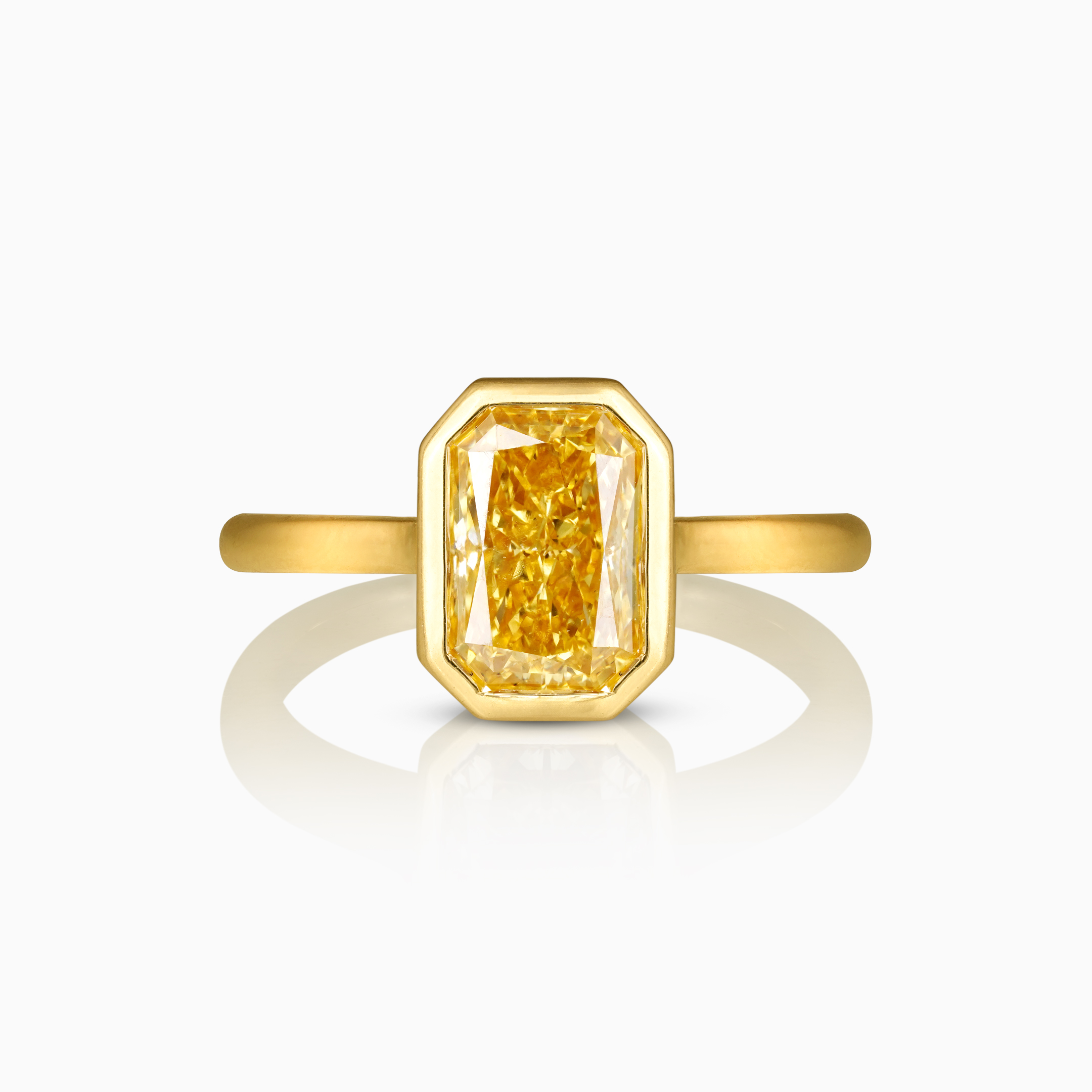 Sunlight captured in gold, the Oria ring is crowned with a fancy vivid yellow lab-grown diamond that is beautifully shaped with a rectangular mixed radiant cut, revealing a mesmerising play of light and depth. The effervescent centre stone commands attention with its bold colour and refined geometry, while the warm gold setting enhances its brilliance, creating a piece that feels both powerful and elegantly modern.
