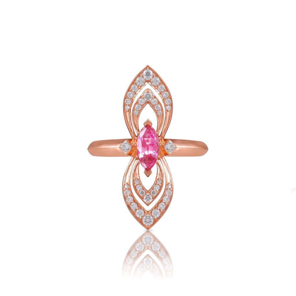 An exotic touch to add to your style is the oval-shaped padparadscha-centred rose gold cocktail ring. This breathtaking design with an orchid-like petal-shaped ring top is decorated with two princess-cut diamond side stones and round brilliant diamonds along the silhouette of the ring top, radiating a stunning glow that enraptures any gaze that may come your way.