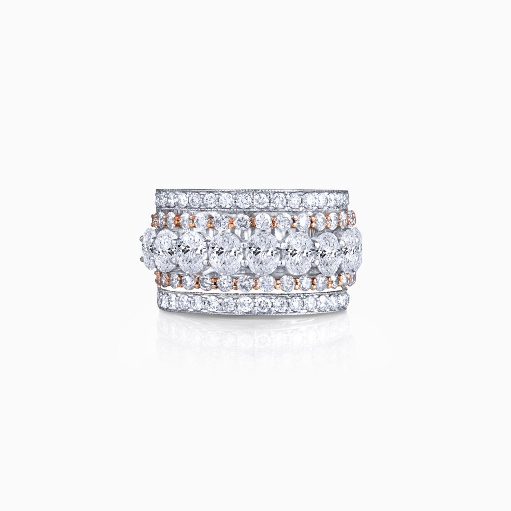 The oval-shaped diamonds and round brilliant diamonds white gold and rose gold ring is a jewel worthy of kings and queens. Studded with a central line of sparkling oval-shaped diamonds, it catches the eye of all beholders. On either side, parallel lines of round brilliant diamonds are set in rose gold add a lush gleam. At the edge, a line of round brilliant diamonds set in white gold beautifully completes the border of the ring.