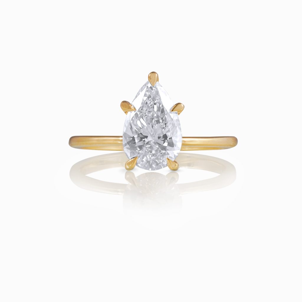 A drop of pure sparkle from the heavens is the elegant yellow gold ring set with a solitaire pear-shaped diamond radiating an unmatched sophistication.