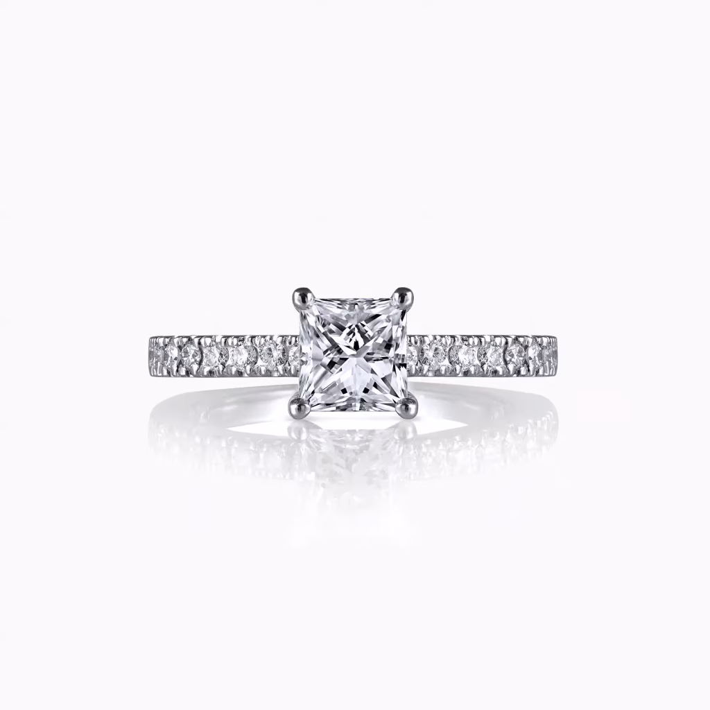 The regal princess cut diamond and round brilliant diamonds white gold ring tells a tale of love. Centred with a scintillating princess-cut diamond, this white gold engagement ring is set with round brilliant diamonds along its shank, creating a constellation-worthy beauty through masterful craftsmanship.