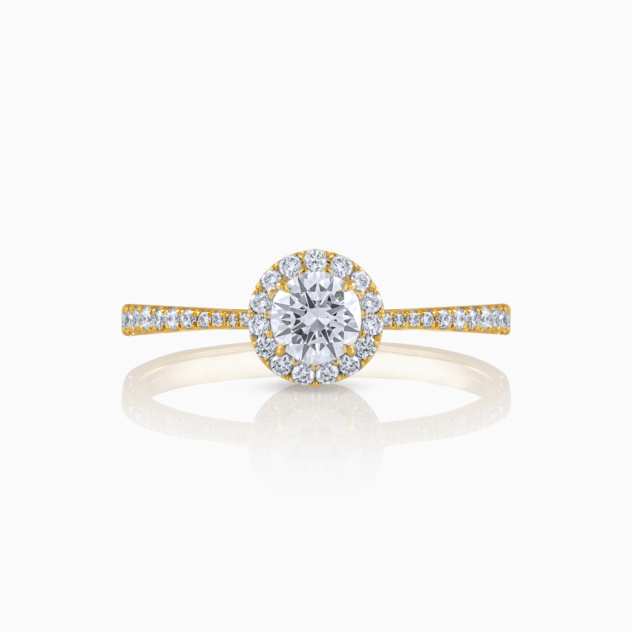 Manifesting love with every sparkle, the Reverie Diamonds Ring is a timeless gift to promise a lifetime together with your beloved. Set with a round brilliant diamond centre stone that is encircled by a glittering diamond halo, this ring is elegantly crafted with a tapered yellow gold band accented with side diamonds.