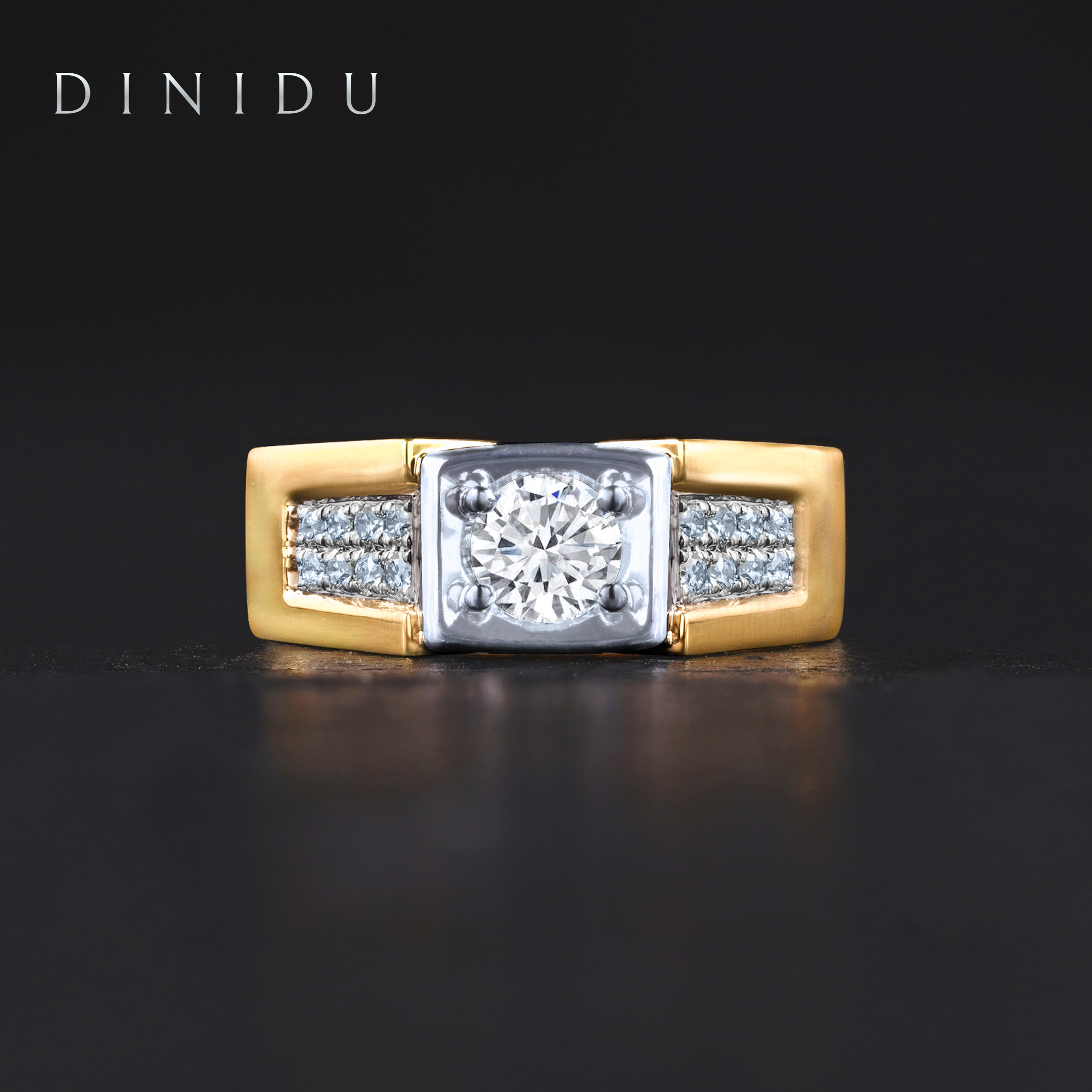 In a tale of two metals woven together like their hearts, this men’s engagement ring is beautifully crafted with a yellow gold band and white gold ring top and gallery that is also set with a gleaming round brilliant diamond centre stone and side diamonds.