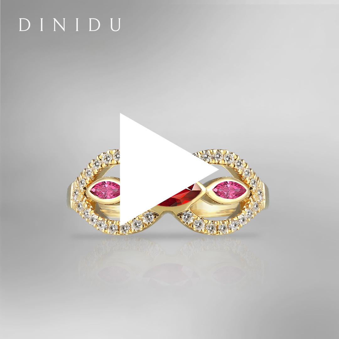 This ruby-embedded yellow gold ring is a unique custom ring design. The marquise-shaped ruby is set between two pink sapphires, giving this vibrant yellow gold ring a feminine spirit with clean, contemporary lines. The band of brilliant diamonds set in the shape of the infinity symbol lends this ring a romantic sensibility with a modern edge.