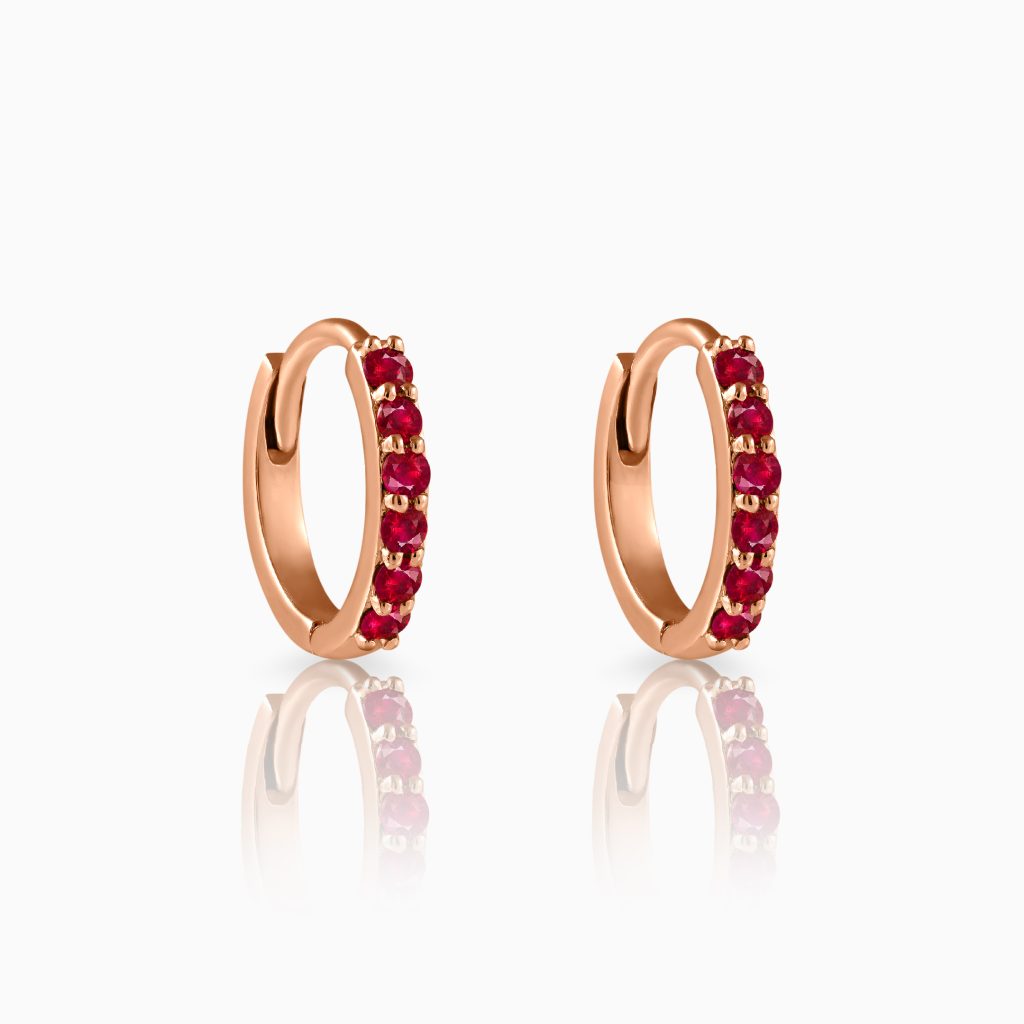 Hoops that carry passion in their every curve, these Rumi earrings are lined with round cut rubies, glowing like embers caught in a gentle embrace. The rubies’ rich crimson hue shimmers against the soft blush of rose gold, creating a timeless dance of romance and radiance.