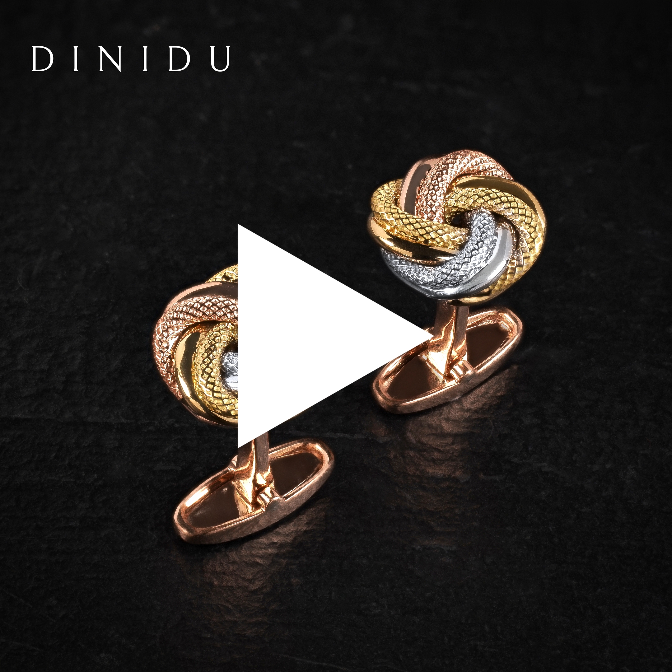 The yellow gold, white gold and rose gold tricoloured cufflinks exude sophistication with their interlocking knot patterns, showcasing a blend of three exquisite gold toned threads that are crafted with a polished finish and intricate impressions.